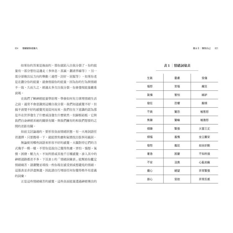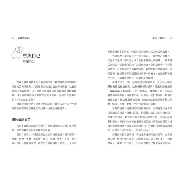 這本書以一個新穎、簡單的前提為基礎:理解情緒力的最佳方法是將它視為自已擁有的能量,而不是一連串要執行的活動或策略。只要學會聰明的駕馭這種能量,就能開始讓人生朝你想要的方向前進。