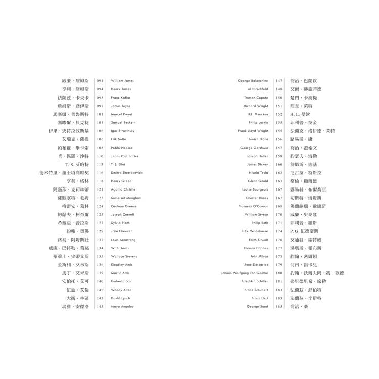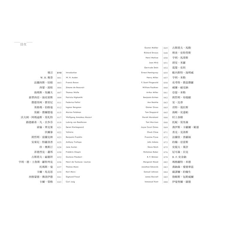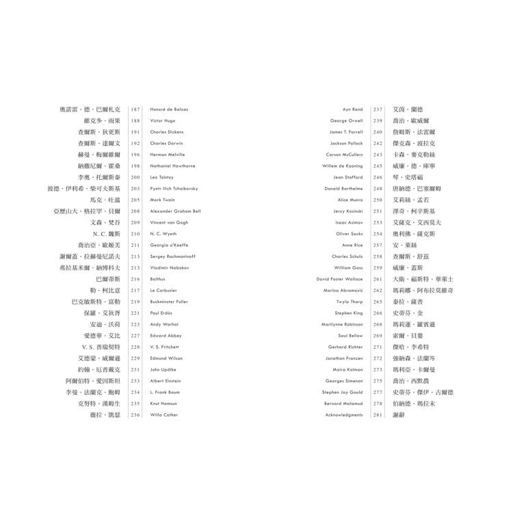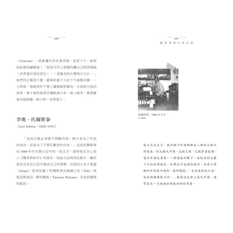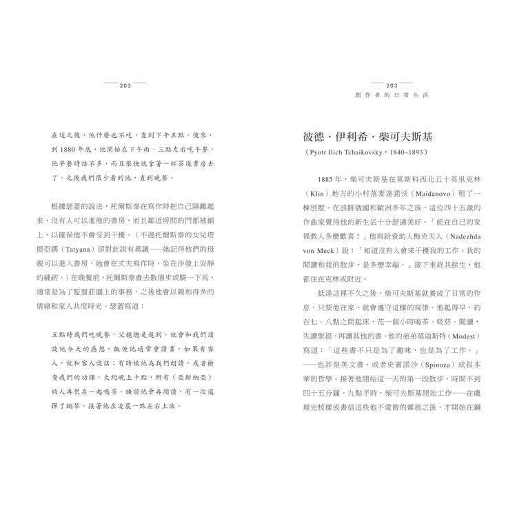 我儘可能讓我的人物自己發言,用引述自他們的信件、日記,和訪問中的言語。我也由二手資料搜羅了他們作息的摘要,如果有別的作家精彩的說明了主題人物的習慣,那麼我就引述其大作,而不再重寫。我要在此說明的是,若非採用數百位傳記作家、新聞記者,和學者的研究與作品,本書根本無法成書。 在匯整本書的各個條目時,我也一直謹記V. S. 普瑞契特(V. S. Pritchett)在1941年寫的一段話。普瑞契特在寫到英國歷史學家愛德華‧吉朋(Edward Gibbon,著有《羅馬帝國衰亡史》)時,提到這位偉大 史學家極其勤勉,即使在服兵役時,吉朋依舊找出時間來作學術研究,他行軍時還隨身帶著羅馬抒情詩人賀拉 斯(Horace)的作品,在帳篷裡則讀異教徒和基督教神學書籍。普瑞契特寫道:「這些偉大的人物遲早都會變成一個模樣,他們從不停止工作,絕不浪費一分鐘,這真教人沮喪。」