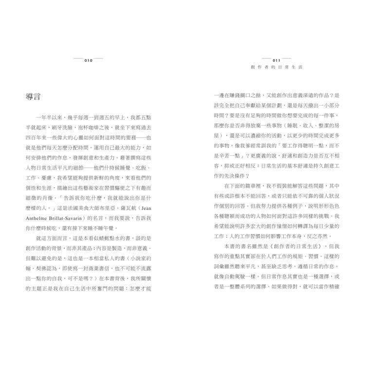 一年半以來,幾乎每週一到週五的早上,我都五點半就起床,刷牙洗臉,泡杯咖啡之後,就坐下來寫過去四百年來一些偉大的心靈如何面對這時間的要務──也就是他們每天怎麼分配時間,運用自己最大的能力,如何安排他們的作息,發揮創意和生產力。藉著撰寫這些人物日常生活平凡的細節──他們什時候睡覺、吃飯、工作、憂慮,我希望能夠提供新鮮的角度,來看他們的個性和生涯,描繪出這些藝術家在習慣驅使之下有趣而細微的肖像。「告訴我你吃什麼,我就能說出你是什麼樣的人。」這是法國美食大師布里亞‧薩瓦航(Jean Anthelme Brillat-Savarin)的名言,而我要說,告訴我你什麼時候吃,還有接下來睡不睡午覺。