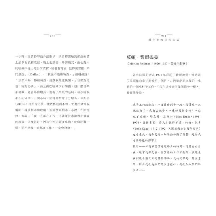 巧的是,正是因為一番拖延,反倒使我創作出本 書。那是2007年7月一個週日下午,我正獨自坐在我 所工作的那家小建築雜誌灰撲撲的辦公室裡,想要趕出次日截稿的稿件。只是我非但沒有全力以赴,趕緊努力,反而卻瀏覽《紐約時報》網路報,清掃我的辦公空間,在小廚房裡泡咖啡,總之就是在浪費時間。這是再熟悉不過的困境,我本是「早起型」的人,在早上可以十分專注,但一過午餐時間就發揮不了什麼作用。那天下午,為了要讓我對自己這種頗為不方便的偏好(誰會想每天大清早五點半就起床?)釋懷,我就在網際網路上搜尋其他作家的工作習性,這種資料並不難找,而且非常有意思。我不禁想到該有人把這些軼事收集起來──因此當天下午我就成立了「日常作息」(Daily Routines)部落格(我那篇雜誌稿到次日早上趕在最後一分鐘驚險交卷),如今就成為這本書。
