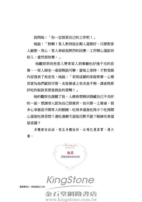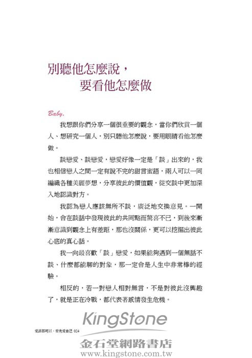 當然,還有好多好多愛的關鍵字,需要我們去消化、吸收,成為愛的養分,但最重要的一個字是「Cherish yourself」!只要你珍愛自己,就不會在愛裡白白受折磨。即使偶爾不小心,嘗受到流淚、憤怒、難堪、痛苦,也千萬要記得:愛自己表示你永遠有選擇快樂的權利!這樣你自然會盡快離開不對的人,然後充滿自信地繼續尋找生命中的真愛!