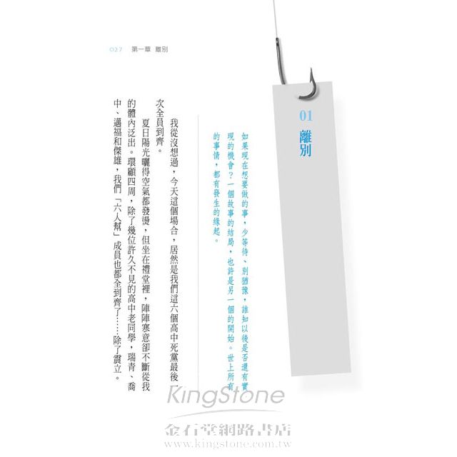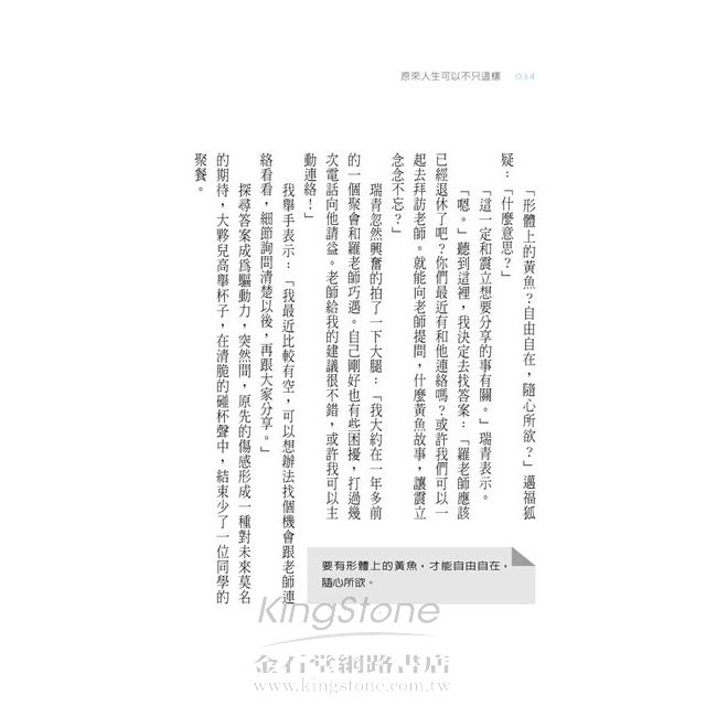 本書很特別的一點是,作者以故事的型態來展現其理念,內容圍繞在六個已畢業超過二十年的高中同學,以及他們當時的班導師。在闊別多年之後,這些人在因緣際會下又再度重逢,並且從彼此之間的分享與互動中,找到生活的意義以及生命的自由。