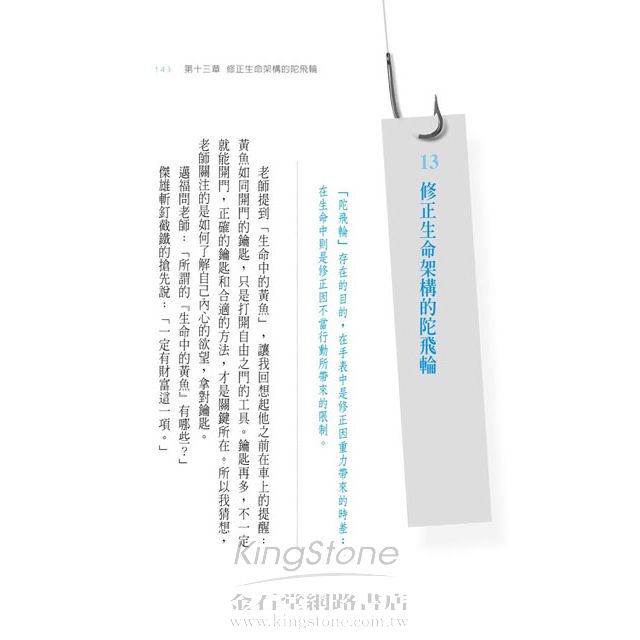 不論是任何人,背後都有一個需求想要被滿足。而這些需求背後的真正目的,通常是為了更加自由自在、隨心所欲。我發現,只要能掌握住其中五把關鍵性的鑰匙(在本故事中是以「黃魚」相稱),並且以「陀飛輪法則」做為判斷的基礎,同時善用主動選擇權,那世上許多看似困難的決定,就不再是阻礙我們追求幸福的絆腳石。而許多世俗的現象,也因此有了可依循的脈絡,不再那麼費解。