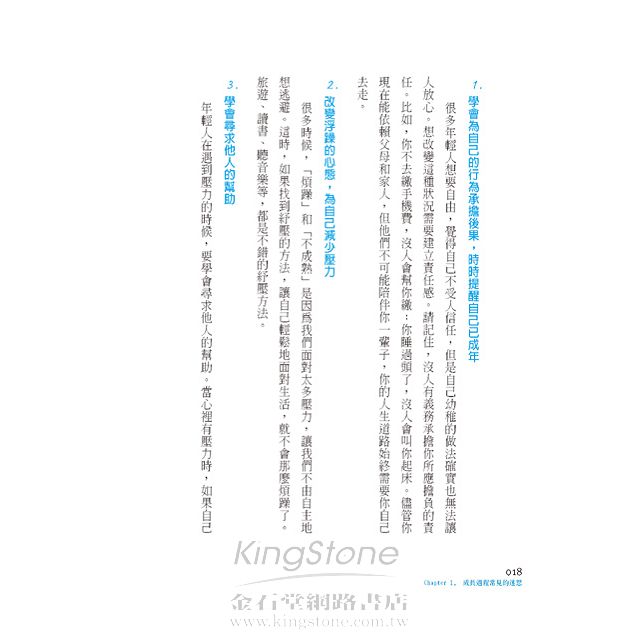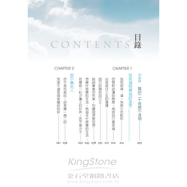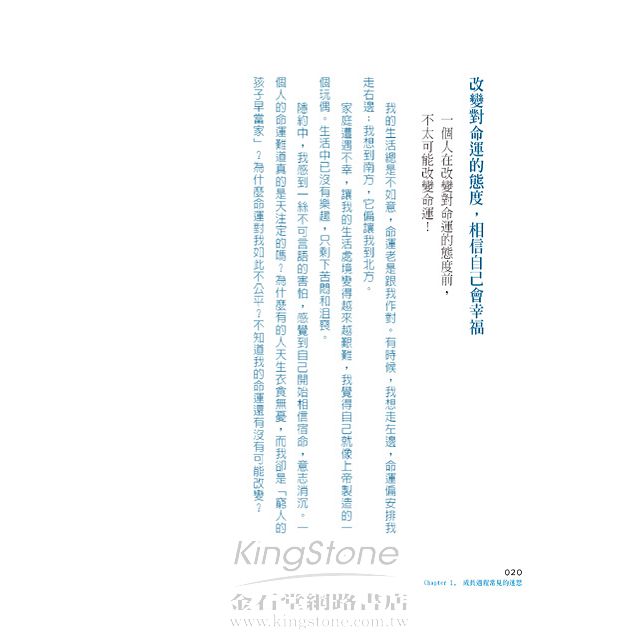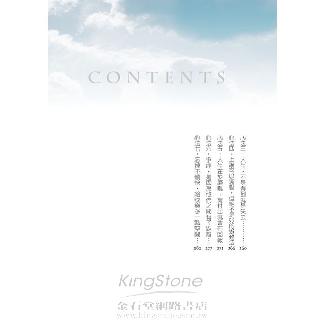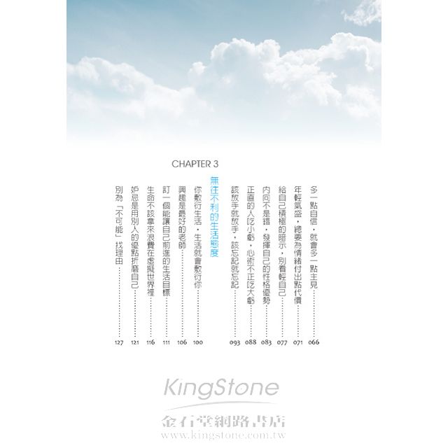 你敷衍生活,生活就會敷衍你/興趣是最好的老師/訂一個能讓自己前進的生活目標/生命不該拿來浪費在虛擬世界裡/妒忌是用別人的優點折磨自己/別為「不可能」找理由/轉行永遠不嫌晚