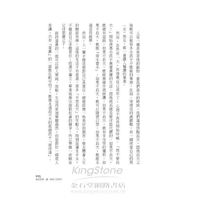 然而,忽然有一天,你發現自己不可阻止地成年了,心裏不由得開始呼喊,“我不要長大!”又轉而開始羡慕孩子們無憂無慮的生活。因為成長總是要付出代價的。如果不長大,就總有退路;如果不長大,就能無條件被保護;如果不長大,就享有哭的權利;如果不長大,就能“倚小賣小”;如果不長大,就可以隨便幻想;如果不長大,就能永遠活得純真……