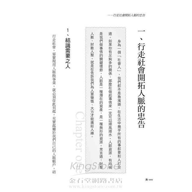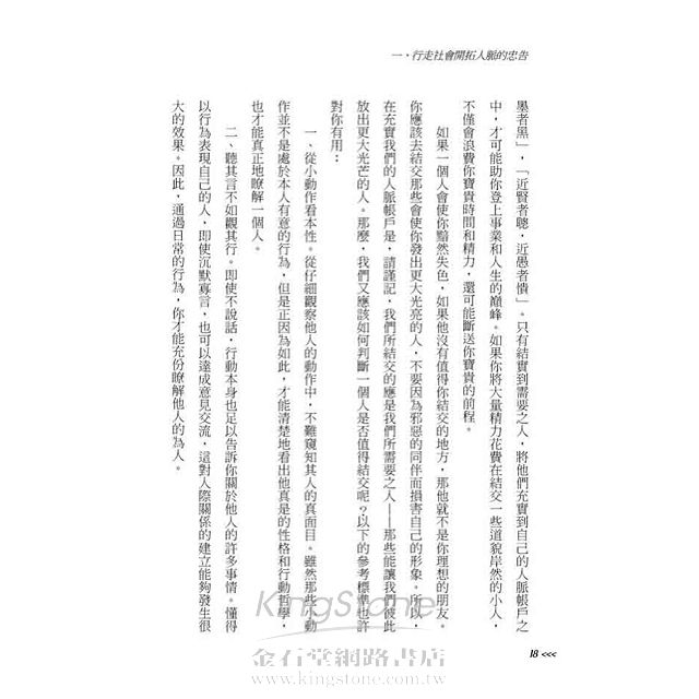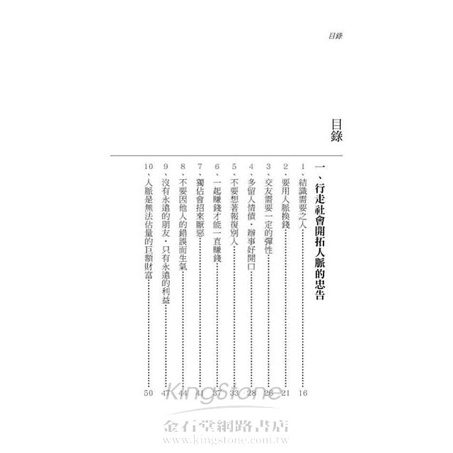 一、行走社會開拓人脈的忠告 ?? 身為一個「社會人」,我們都不是魯濱遜,在生活中幾乎所有的事都要和人打交道。如果你有足夠多的關係,那麼在做起事情來一定可以順風順水。人脈資源,有時候是我們做事情的關鍵環節,人脈是一種潛在的資產,是一種無形的資源。常言道:財聚人散,財散人聚。就是在告訴我們為人要慷慨、大方才能廣結人緣。 1、結識需要之人