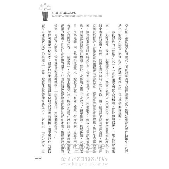 管仲可謂是一位奇才,但是他如果沒有鮑叔牙這個朋友的包容和提攜,也不可能成為幫助齊桓公建立霸主地位的英雄。可以說,鮑叔牙正是管仲需要之人。古語有云:「近朱者赤,近墨者黑」,「近賢者聰,近愚者憒」。只有結實到需要之人,將他們充實到自己的人脈帳戶之中,才可能助你登上事業和人生的巔峰。如果你將大量精力花費在結交一些道貌岸然的小人,不僅會浪費你寶貴時間和精力,還可能斷送你寶貴的前程。