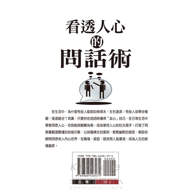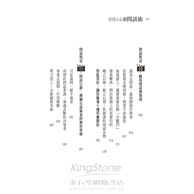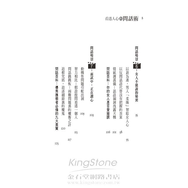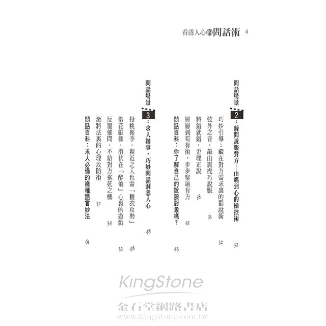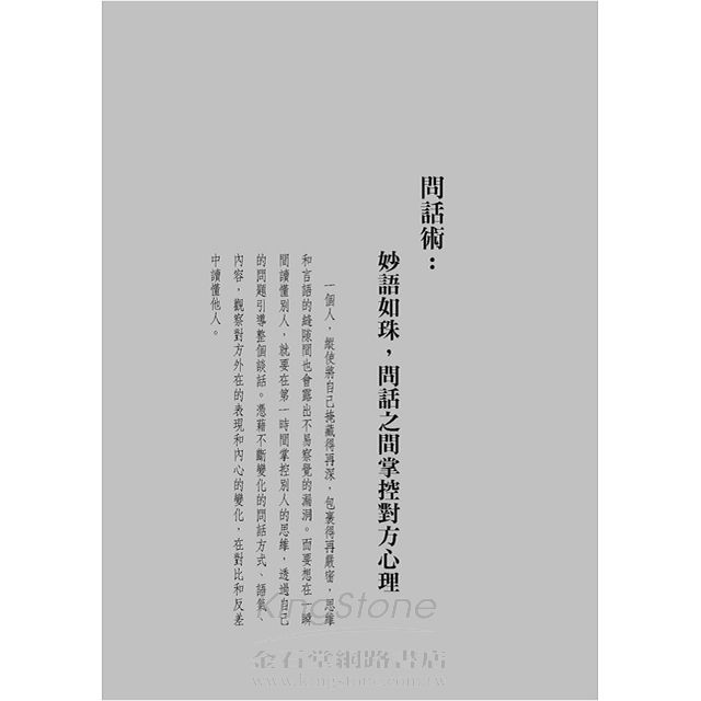 本書重點在強調問話術的技巧,根據話題洞察說話者的內心,根據說話方式洞察說話者的心理,更以不同說話場景,用不同的對象加以分析,讓讀者了解各個領域上所要學會與人相處,我們必須了解他人的性情,學會與不同性情的人進行交往。了解了周圍人的個性,再針對對方喜惡的不同,施以不同的手段,只有這樣,才能在與人的博弈中獲勝,更可以讓你少走彎路,提早取得成功。