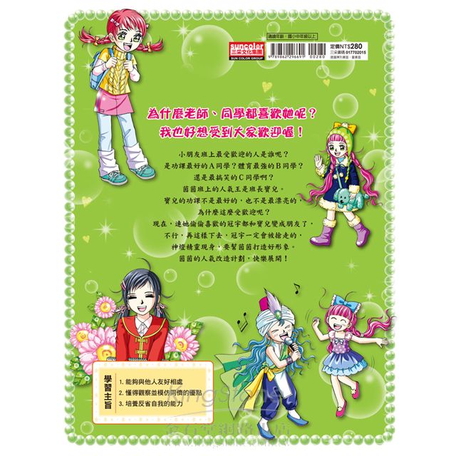 究竟茵茵是否能在人緣好的朋友們身上找出人見人愛的祕訣,讓自己成為同學們都想親近的人氣王呢?現在就讓我們跟茵茵一起學習如何讓自己受歡迎,努力成為比別人更快樂且充滿自信的小學生吧!