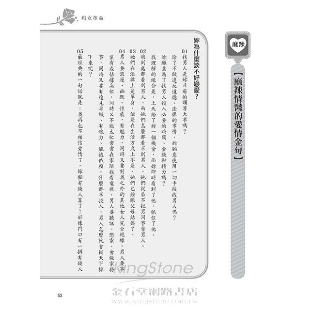 在「麻辣情醫」面前,不要妄圖得到絲毫的安慰,因為,她的專長並不在於繼續幫妳自欺欺人。她只會客觀的分析現實,然後直接告訴妳,自省才是王道,更是解脫之道。如果,妳能hold 住她的麻辣語錄,那麼妳離幸福也就不遠了。