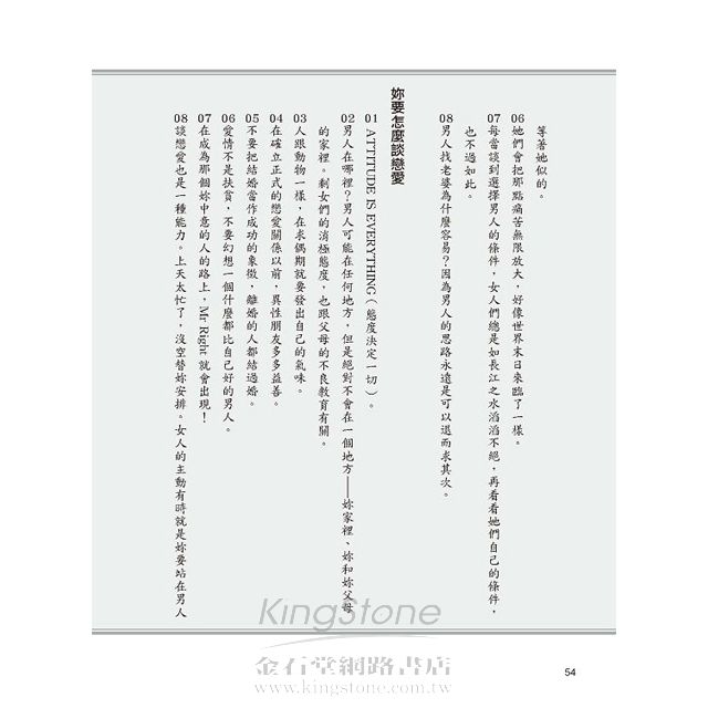 感情不是碰運氣!愛情拒絕「白菜價」!剩女們,覺悟吧!翻牌大作戰開始了:轉換心靈,寧缺毋濫,對「愛無能」說NO!遠離教條,勝女不剩,幸福Hold住!