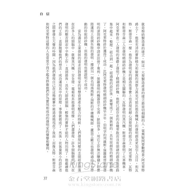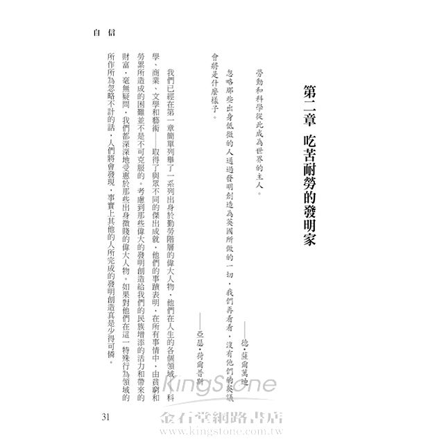 自助的精神,正如它在充滿活力的個人行為中所表現出來的那樣,一直都是英國人性格中一個令人注目的特徵,是衡量我們作為一個民族的力量的真正尺度。儘管總能發現一些鶴立雞群、遠遠優秀於其他人的人享受公眾對他們的臣服和敬意,但我們的進步更多要歸功於眾若繁星的「小人物」和默默無聞的普通人。雖然在任何一場偉大的戰爭中,都只有將軍們的名字名垂青史,但從一個大的意義上講,正是由於士兵們的勇猛和英雄主義,才贏得了戰爭的勝利。同樣的,生活也是一場「士兵的戰鬥」——無論哪個時代,最偉大的勞動者都是各個階層的普通人,其中絕大多數終生都默默無聞,他們對人類文明與進步的影響力當然無法與那些更加幸運、名垂青史的偉人們相比。但是,即使是出身最低賤的人,只要他在自己的生活中為同胞作出了勤奮、節儉、正直、誠實的表率,他就對其祖國的幸福生活擁有了現時和長遠的影響了,因為他的生活和品行會潛移默化地影響他人的生活,成為未來的好榜樣。