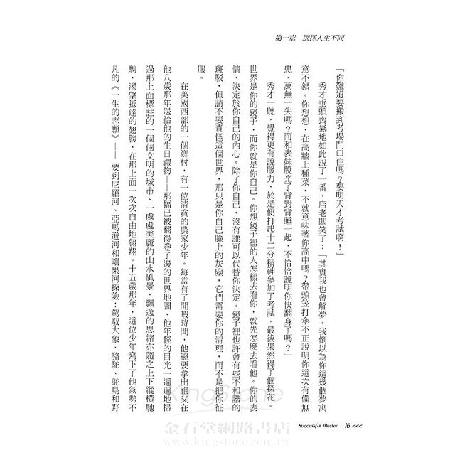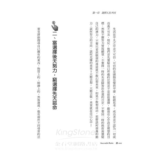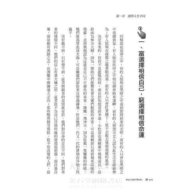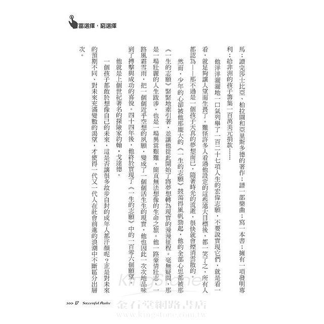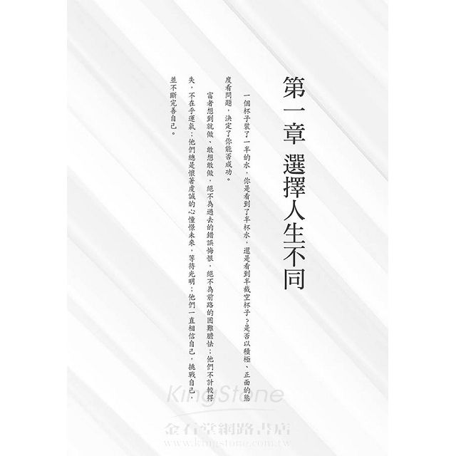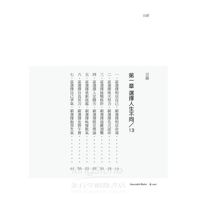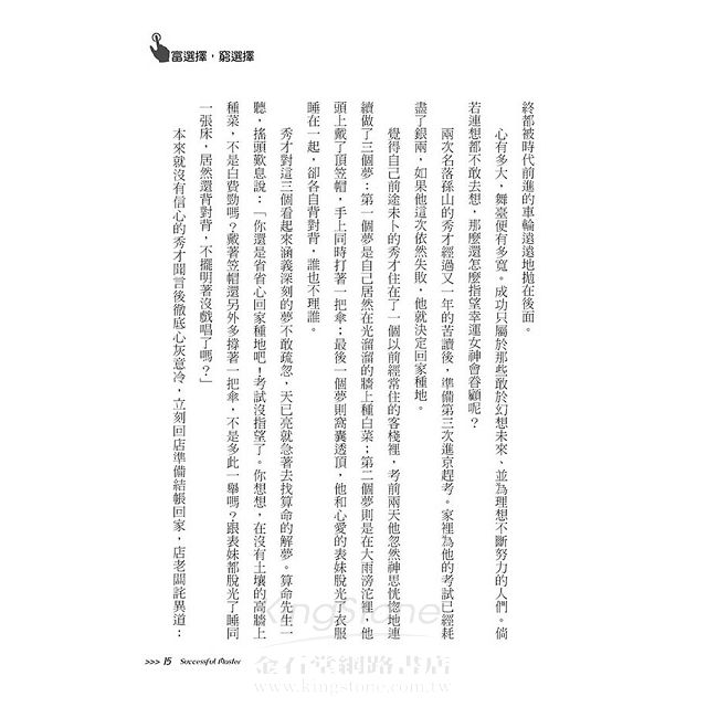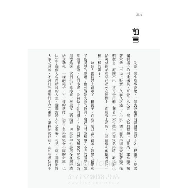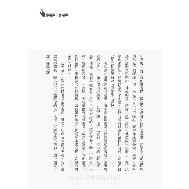 所以你必須學會自己選擇。而本書正是透過一百餘個寓意深刻,韻味雋永的小故事,深入淺出地講述了人生百態,你可以看到,書中的三教九流,形色種種,他們是如何為自己人生做選擇的。讀者掩卷之餘,可將書中人物、細節與現實一一對應,並細細體會各種要旨:成功之富者,為何選擇,如何選擇,選擇後又如何貫徹,這些道理也許在你看完本書之後,都會有更深刻的理解。