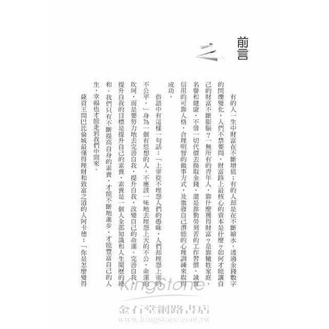 有的人一生中財富在不斷增值;有的人却是在不斷縮水。透過金錢數字的閃爍變化,人們不禁要問,財富路上最核心的資本是什麼?如何才能讓自己的財富不斷膨脹?一無所有的青年人,靠什麼獲得財富?是靠犧牲家庭、名譽和健康,不惜一切代價去換取金錢,還是靠勤勞刻苦的工作習慣,誠實信用的可靠人格,合理明智的做事方式,及激發自己潛能的心理訓練來取得成功。
