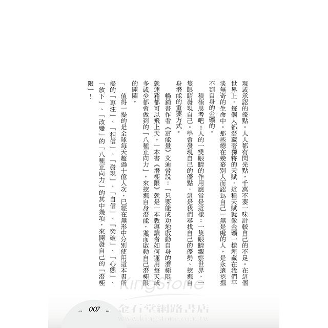 本書《潛極限》就是一本教導讀者如何運用每天或多或少都會做到的「八種正向力」,