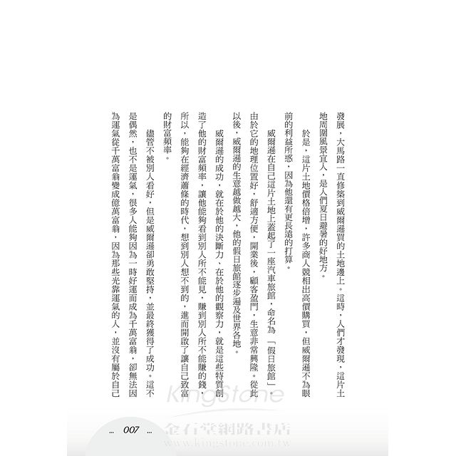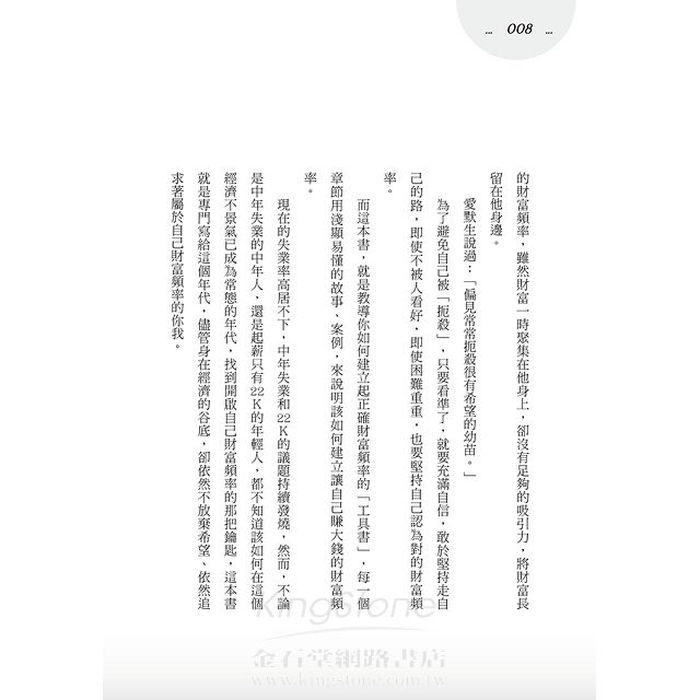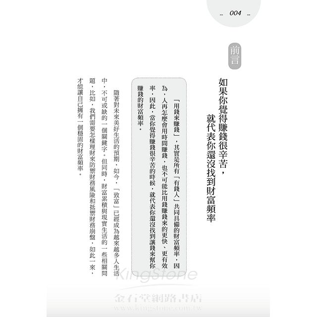 而這本書,就是教導你如何建立起正確財富頻率的「工具書」,每一個章節用淺顯易懂的故事、案例,來說明該如何建立讓自己賺大錢的財富頻率。