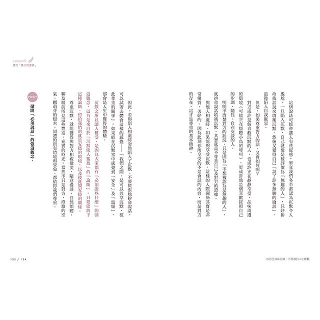◎沉默之所以讓人難受,是因為大家都有「必須說些什麼」的強迫觀念,為了「不想被認為無趣」,只好拚命找話來說。只要能放下「沉默使人尷尬」的「論斷」,留給我們的就是安穩的環境、以及彼此之間安穩的關係。