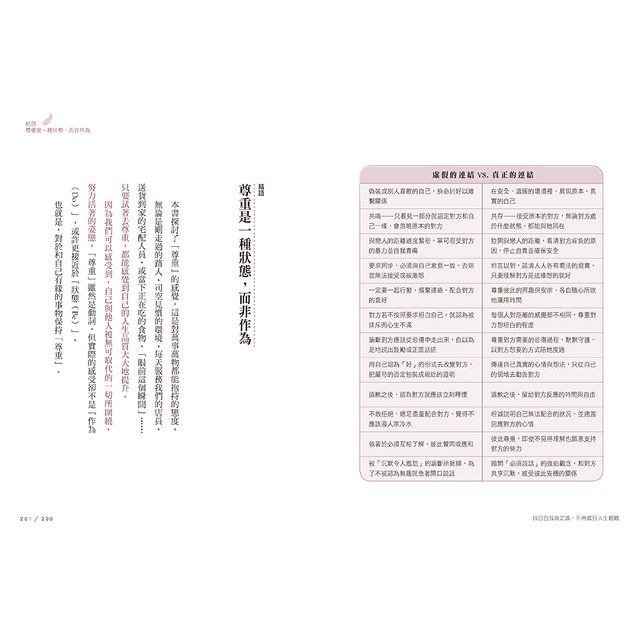 只要尊重對方,就會盡可能想保持坦誠,也會明白「偽裝自己」而受眾人歡迎,其實是一種欺騙,更是與尊重對方的態度完全背道而馳。