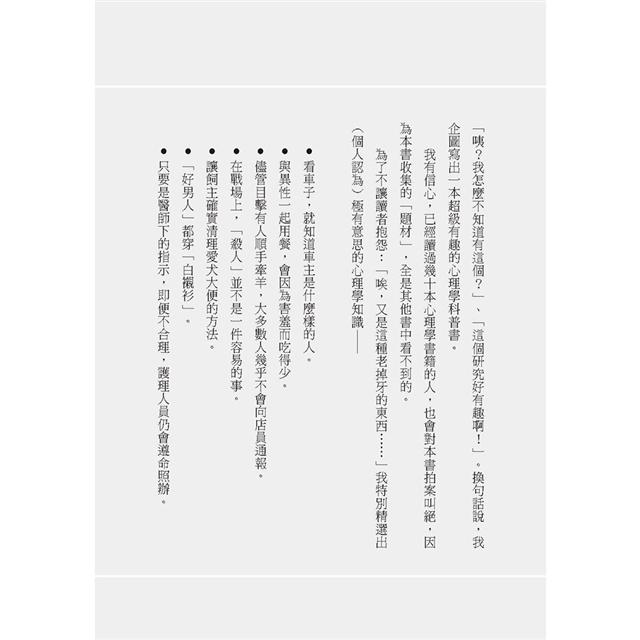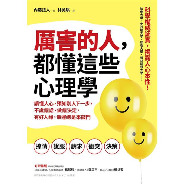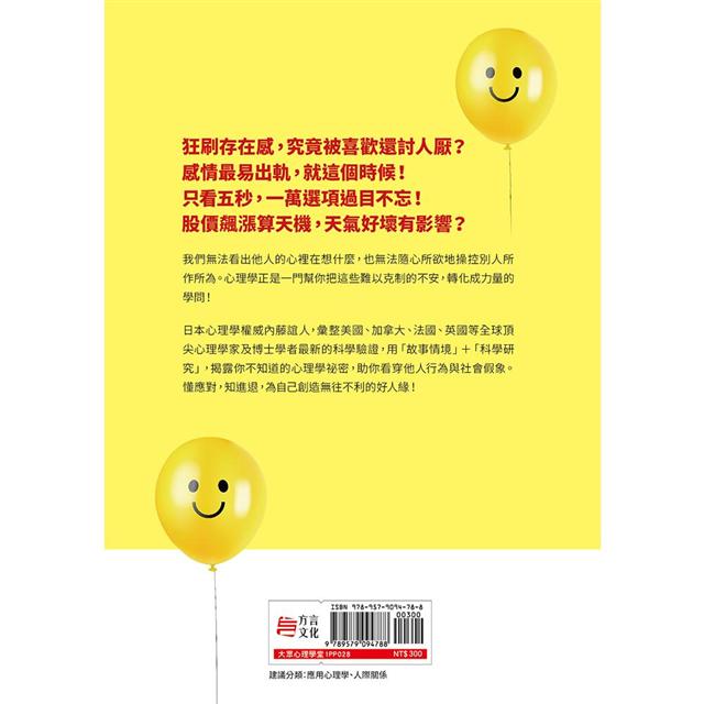日本心理學權威內藤誼人,彙整美國、加拿大、法國、英國等全球頂尖心理學家及博士學者最新的科學驗證,88則超有梗心理學,用「故事情境」+「科學研究」,揭露你不知道的人性,助你看穿他人行為與社會假象。懂他人心理,就能過更好!