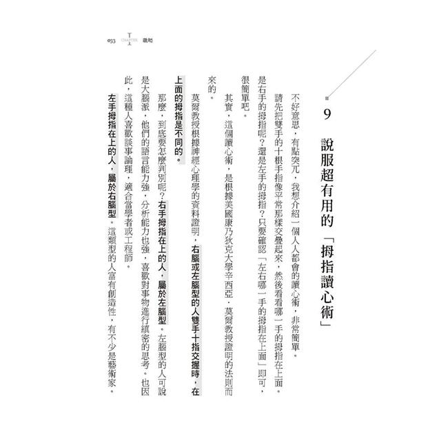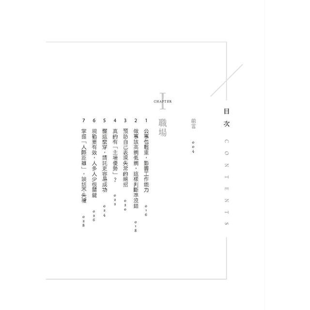 公事包輕重,影響工作能力/做事該高調低調,這樣判斷準沒錯/預防自己表現失常的絕招/真的有「主場優勢」?/懂這麼穿,請託更容易成功/規勸要有效,人多人少很關鍵/掌握「人際距離」,談話不失禮/加大記憶容量的訣竅/說服超有用的「拇指讀心術」/讓人不自覺答應的「暗示術」/王牌業務員都有的特徵/要人命?沒想像簡單/逼出「團隊潛能」有妙方/解讀員工個性,辦公桌線索多/絕對服從易釀大禍,也是人性/建立人脈的黃金期限/上台說話的不安感,怎麼消除?