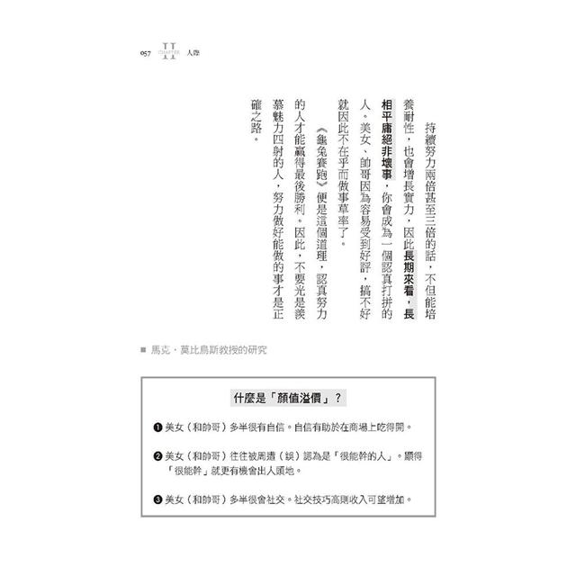以貌取人是天性,第一印象很重要/同工不同酬?差別原因在魅力/薪水與外貌成正比的「顏值溢價效應」/讓服務業精疲力竭的「微笑壓力」/家裡越晚出生越討喜,為什麼?/人類天生愛模仿,喜歡跟風照著做/白天冷漠、夜晚熱忱的「責任分散效應」/把關係變緊密的「負面恐懼情緒」/不自覺產生好感的「姓名同字效應」/人們愛記仇?「選擇性記憶」是原因/小心「個人空間」界線,能避免衝突/越完美越容易被討厭,為什麼?/偏袒「自己人」,人類潛意識難根除/使出這一招,團隊會更凝聚/領導者臉越大,越有領導力?/圍觀熱鬧看越久,越易脫序/給人絕對好印象的「穿搭術」/藝人偏愛奇裝異服,有貓膩