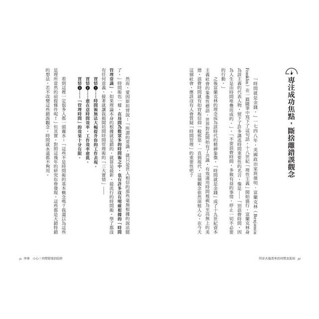 除此之外,內容詳盡介紹超過三十種時間技巧,從中與你的「時間感類型」相對應,進一步確信是自己最適合的方法,從沒有效率中解脫,徹底打敗奪走你時間的最大敵人。