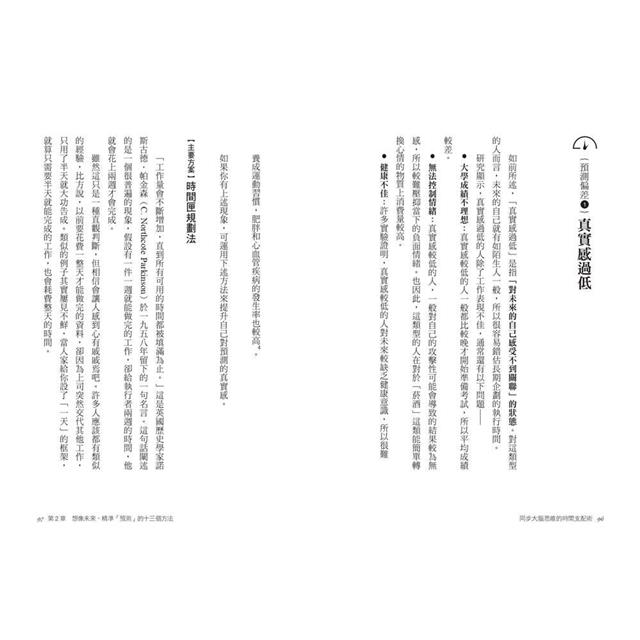 順帶一提,我自己也因為這套時間術而受益良多。以前我一年頂多只能寫一本書,現在每年出三~四本都不是問題。這並沒有打亂我原本的工作慣例,像是平均一天讀十五篇論文,寫兩萬~四萬字的稿子,定期上傳九十分鐘~一百二十分鐘的影片……;也沒有因此犧牲私人時間,我還是照常睡覺和運動,並維持以往的興趣與愛好,按時閱讀、看電影、練習樂器。這些都是我根據「時間知覺」重組日常生活的成果。