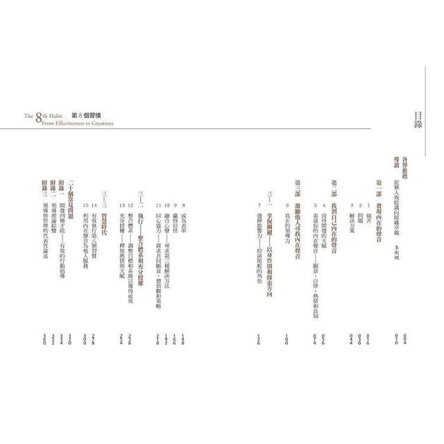 如果說7個習慣能建立個人成熟度與人際影響力,而第8個習慣,就是引導有使命感的領導人,首先找到自己的內在聲音,也能激勵他人尋找內在聲音的新時代領導力。……柯維運用「全人思維模式」說明人類有四大基本需求:生活、愛、學習成長及發揮影響力。……希望你也能從書中找到「內在的聲音」,從效能邁向卓越。── 李俐嫺,前富蘭克林柯維台灣總經理