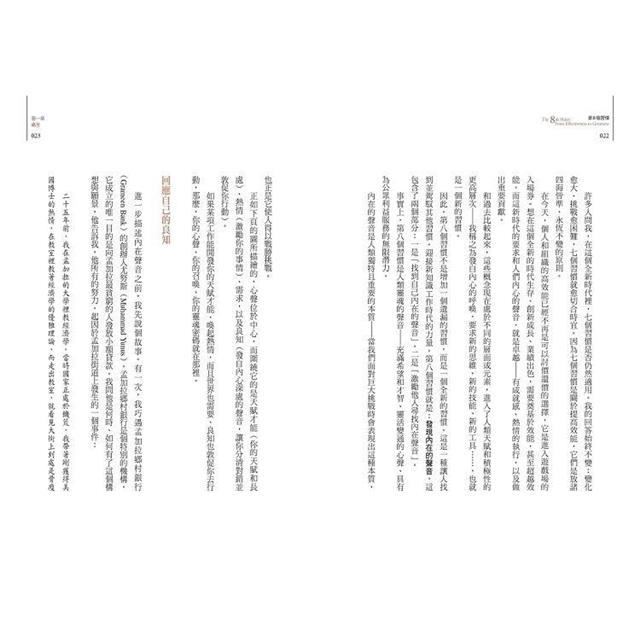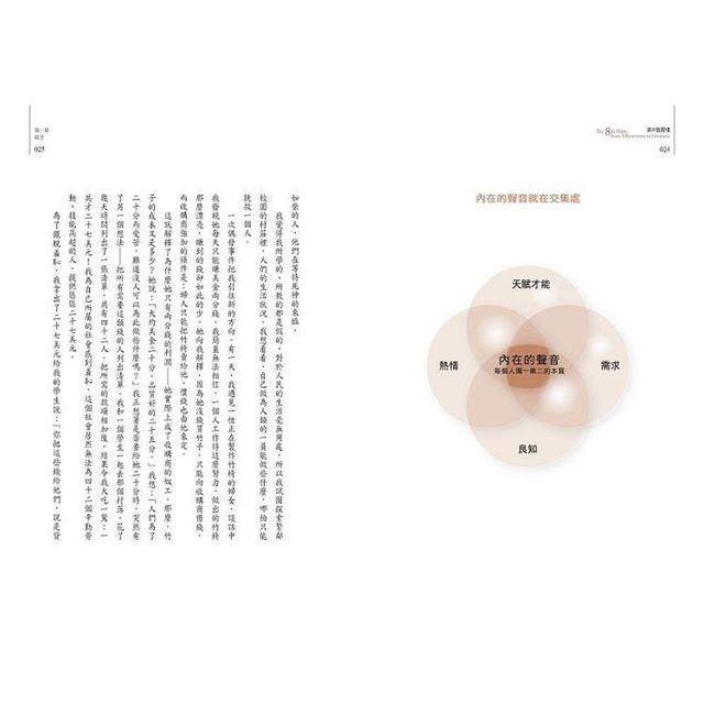然而,高效能僅僅是這個時代生存、創新、持續成長的基本面,使人每天安然度過高壓、求新求變的挑戰。當今還有一種更高層次的習慣,能真正引發個人深層的動機。如果說七個習慣能建立個人成熟度與人際影響力,而第八個習慣,就是引導有使命感的領導人,首先找到自己的內在聲音,也能激勵他人尋找內在聲音的新時代領導力。