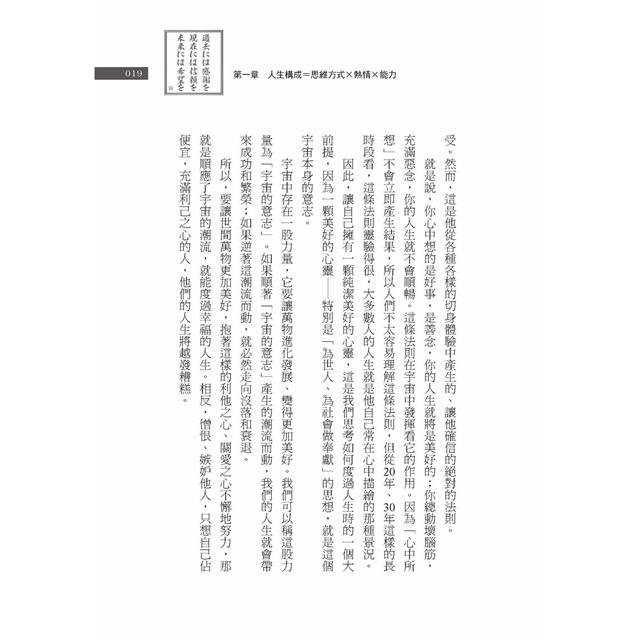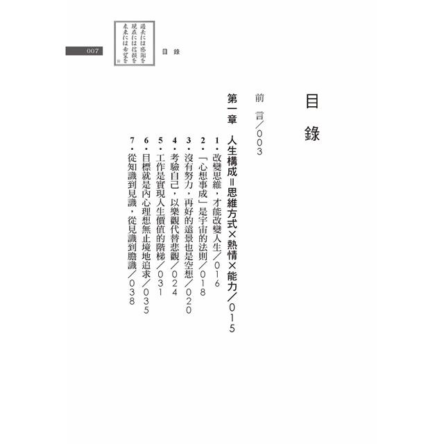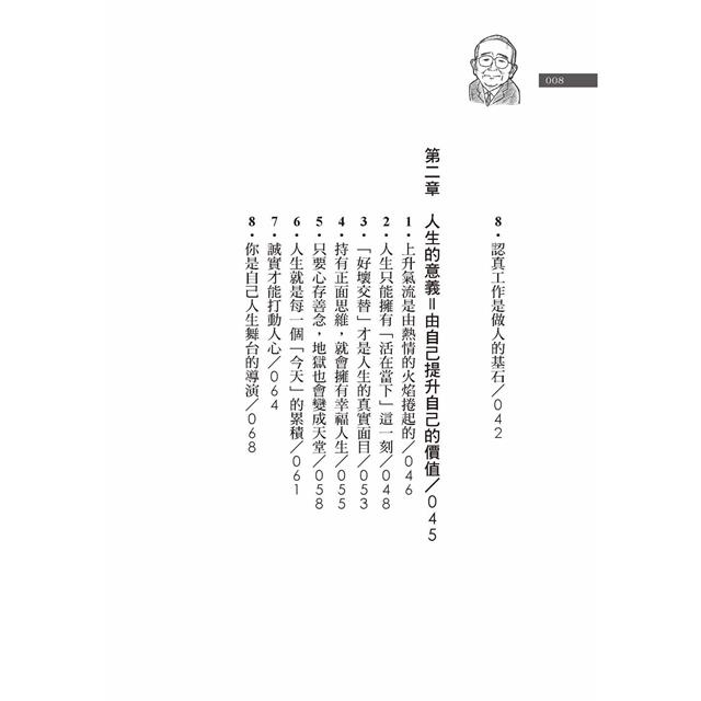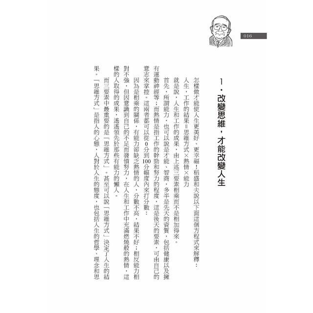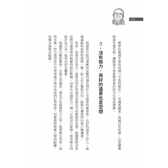 《稻盛和夫人生哲學》這部作品並不是什麼高深奧妙的哲理書,它只是提供你另一種思維方式、一種心態、一種人生的態度,不管你現在的人生位置在哪裡,你的生活仍會繼續下去,你的思維也會一直在你身上,向右向左、向上向下,一切都操之在你。所以,你絕對可以選擇,如何做你自己!