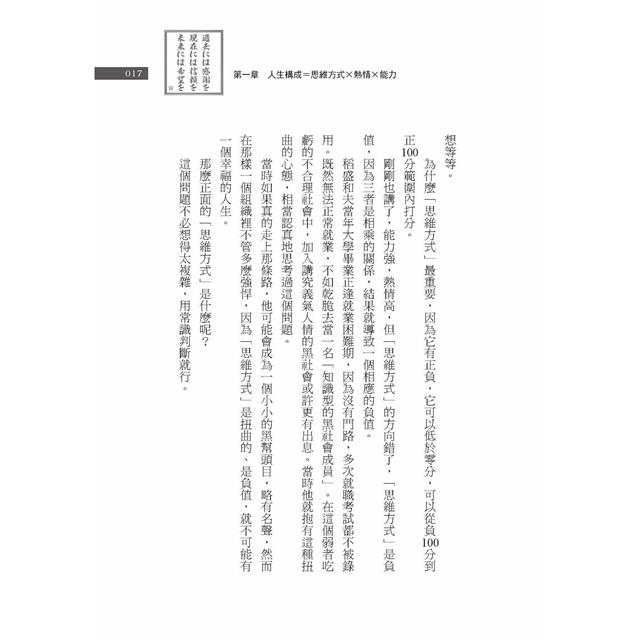 其中,最重要的是「思維方式」。不論熱情和能力的分值多高,如果思維方式方式為消極負數的,人生則不會有好的結果,來之不易的熱情和能力也都會付諸東流。