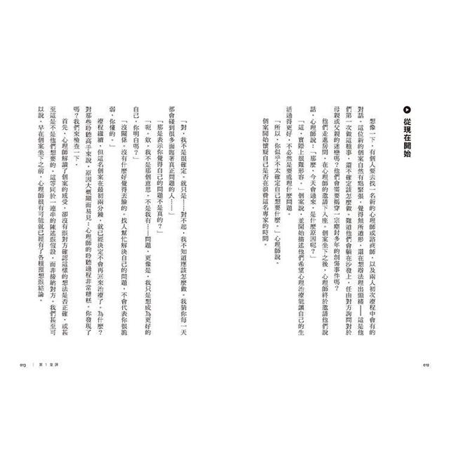 翻開第一章,作者即以「心理諮商師與個案」的對話作為開篇範例,正當你對諮商師的專業判斷、見微知著佩服不已時,作者卻迅速指出「這名個案在最初兩分鐘,就已經決定不會再回來治療了」。