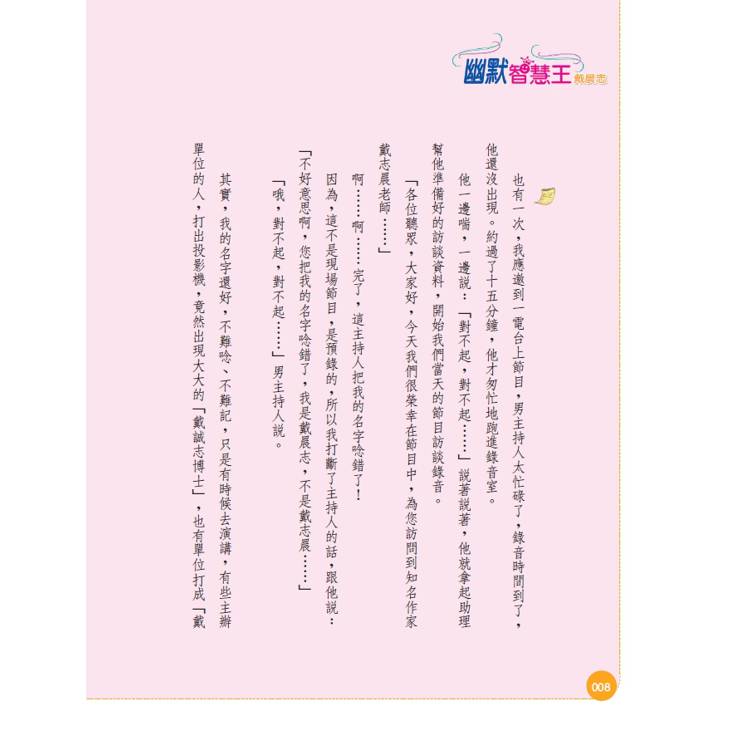 在本書中,戴晨志老師收集了一篇篇幽默輕鬆、妙趣橫生又耐人尋味的幽默小故事,搭配上生動活潑的精彩插畫,陪伴大家在一連串的如珠妙語中分享愉悅與歡笑,同時也能從中領略幽默的表達技巧,學會放鬆自己、製造快樂,讓別人一起如沐春風。快卸下嚴肅面具、加滿快樂油門,讓自己成為幽默智慧王吧!