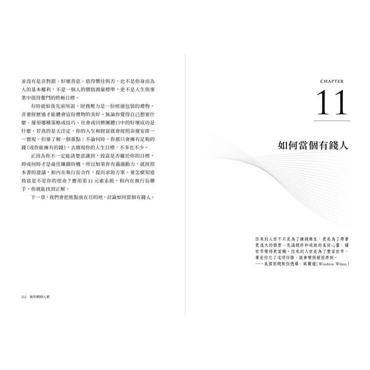 不管你想從事網路創業、居家創業、直銷網絡事業、小企業、百萬美元公司,或是億萬美元事業都不是重點。你是否想靠交易股票或債券、房地產買賣,或進行其他投資賺大錢,也不重要,不管是什麼,你都能運用第11元素取得大躍進。