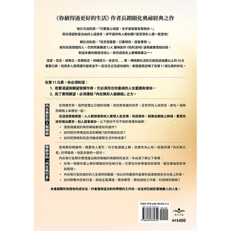 「《無形網路元素》揭示了現代人如何透過覺察與『內在執行長』連結,掌握無形的能量網路,提升自我領導力。在這本書中,讀者將發現內在智慧的巨大潛力,並學會以靈性力量引導事業與生活,成就豐盛人生。」