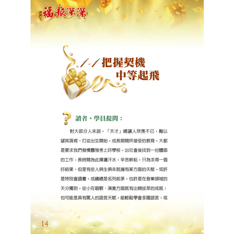 此刻的你,有幸能夠閱讀《福報深深》一書,代表心心念念的豐盈福分即將現前,只差你付諸實驗的臨門一腳,開啟不可多得的人生契機,即能擁有無數人朝思暮想、求之不得的美好際遇。這可能是他人畢生遍尋不著的難得妙方,只要妥善運用書中講述的法寶,將內容融會貫通、按部就班地實行,必定得以穩當自如地奪標,在人群間嶄露頭角,進而大放異彩。本書不同於坊間的勵志書籍,不會淪為曇花一現的希望火苗,或僅以心靈雞湯振奮人心,鼓勵向美好的人生目標前行;然而往往閱讀當下感動莫名,一旦回歸現實生活,面對關卡時依舊不得要領,無法自行排解當前難題,走出困境。