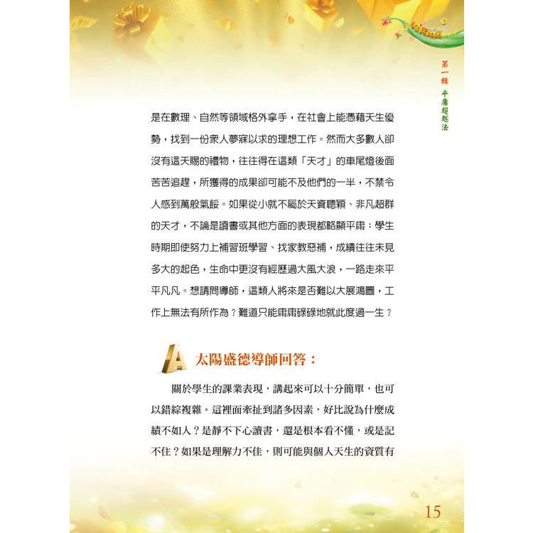 對大部分人來說,「天才」總讓人欣羨不已,難以望其項背。打從出生開始,成長期間所接受的教育,大都是要求我們發憤圖強考上好學校,出社會後找到一份體面的工作;長時間為此揮灑汗水,辛苦耕耘,只為求得一個好結果。但是有些人與生俱來就擁有某方面的天賦,或許是特別會讀書,成績總是名列前茅;也許是在音樂領域的天分獨到,從小在唱歌、演奏方面就有出類拔萃的成就;也可能是具有驚人的語言天賦,能輕鬆學會多國語言;或是在數理、自然等領域格外拿手,在社會上能憑藉天生優勢,找到一份眾人夢寐以求的理想工作。然而大多數人卻沒有這天賜的禮物,往往得在這類「天才」的車尾燈後面苦苦追趕,所獲得的成果卻可能不及他們的一半,不禁令人感到萬般氣餒。如果從小就不屬於天資聰穎、非凡超群的天才,不論是讀書或其他方面的表現都略顯平庸;學生時期即使努力上補習班學習、找家教惡補,成績往往未見多大的起色,生命中更沒有經歷過大風大浪,一路走來平平凡凡。想請問導師,這類人將來是否難以大展鴻圖,工作上無法有所作為?難道只能庸庸碌碌地就此度過一生?