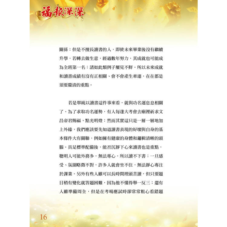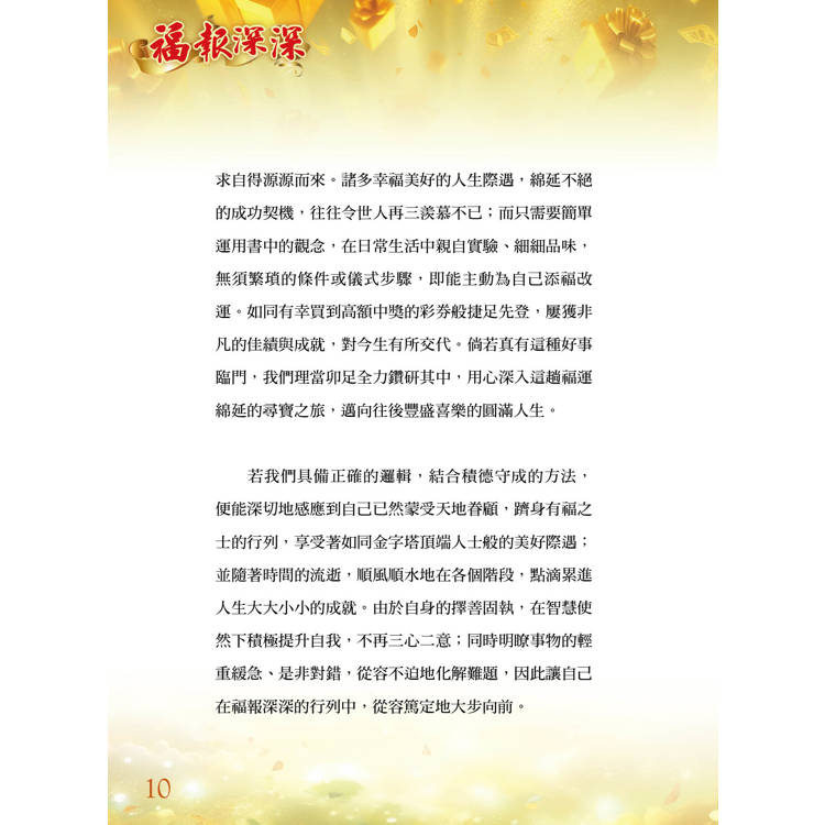 若我們具備正確的邏輯,結合積德守成的方法,便能深切地感應到自己已然蒙受天地眷顧,躋身有福之士的行列,享受著如同金字塔頂端人士般的美好際遇;並隨著時間的流逝,順風順水地在各個階段,點滴累進人生大大小小的成就。由於自身的擇善固執,在智慧使然下積極提升自我,不再三心二意;同時明瞭事物的輕重緩急、是非對錯,從容不迫地化解難題,因此讓自己在福報深深的行列中,從容篤定地大步向前。當你全然明瞭眼前這條重要的道路非同尋常,極可能承載、運轉著你今生與來世的斐然成就,便會明白此刻的抉擇是多麼意義非凡且不容錯失。假若不久的將來,你的福運因本書而深厚充沛,人生際遇益發精彩順遂,務必謹記與身旁友人分享你的故事,並廣邀八方有緣之士共襄盛舉;透過福報串聯這分愛與關懷,同時散播到世界各個角落,讓更多朋友因此書踏上正確的軌道,感受到「福報深深」不可多得之妙。