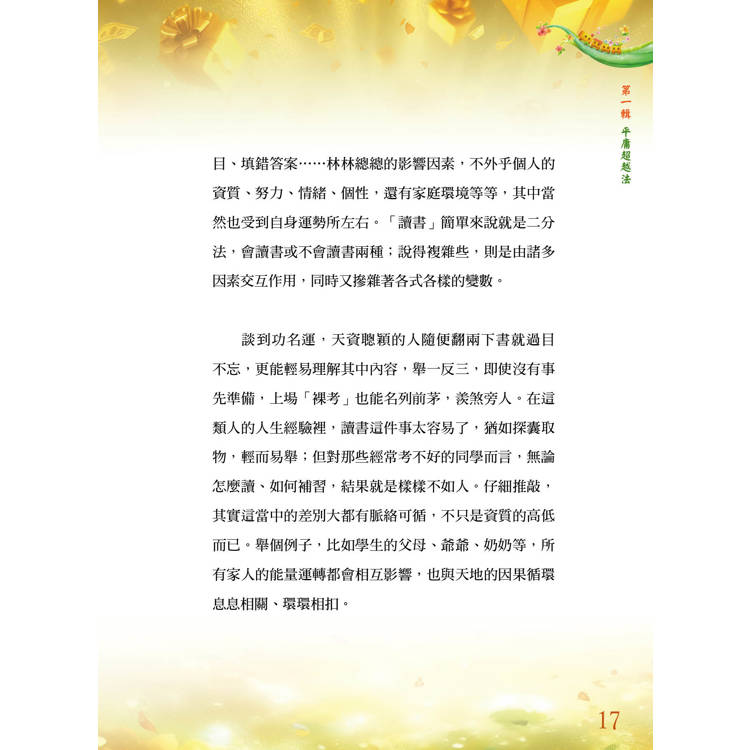 談到功名運,天資聰穎的人隨便翻兩下書就過目不忘,更能輕易理解其中內容,舉一反三,即使沒有事先準備,上場「裸考」也能名列前茅,羨煞旁人。在這類人的人生經驗裡,讀書這件事太容易了,猶如探囊取物,輕而易舉;但對那些經常考不好的同學而言,無論怎麼讀、如何補習,結果就是樣樣不如人。仔細推敲,其實這當中的差別大都有脈絡可循,不只是資質的高低而已。舉個例子,比如學生的父母、爺爺、奶奶等,所有家人的能量運轉都會相互影響,也與天地的因果循環息息相關、環環相扣。