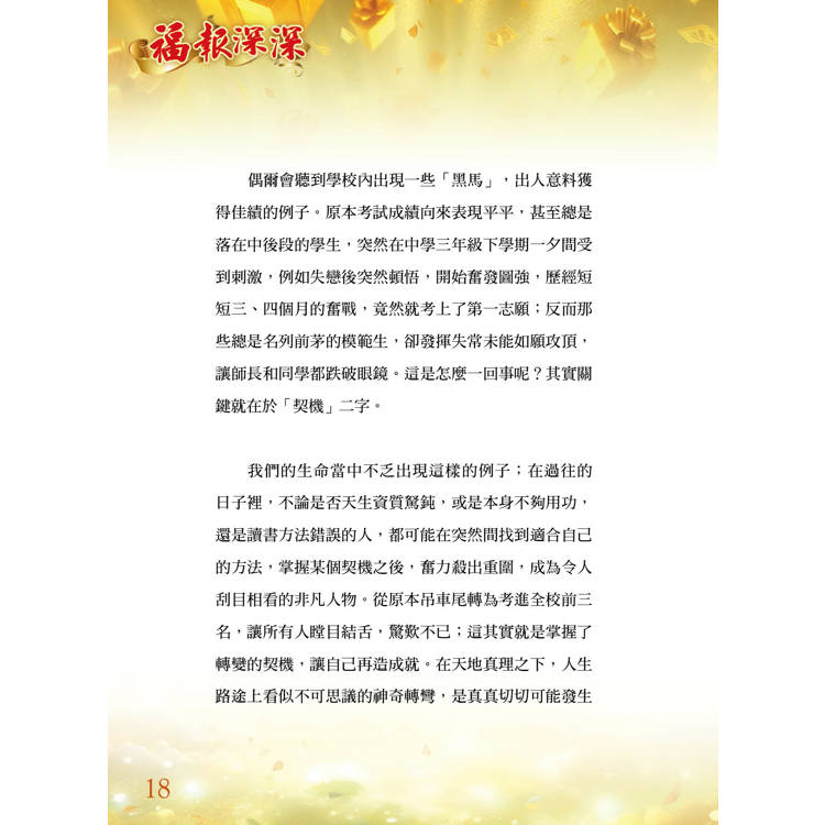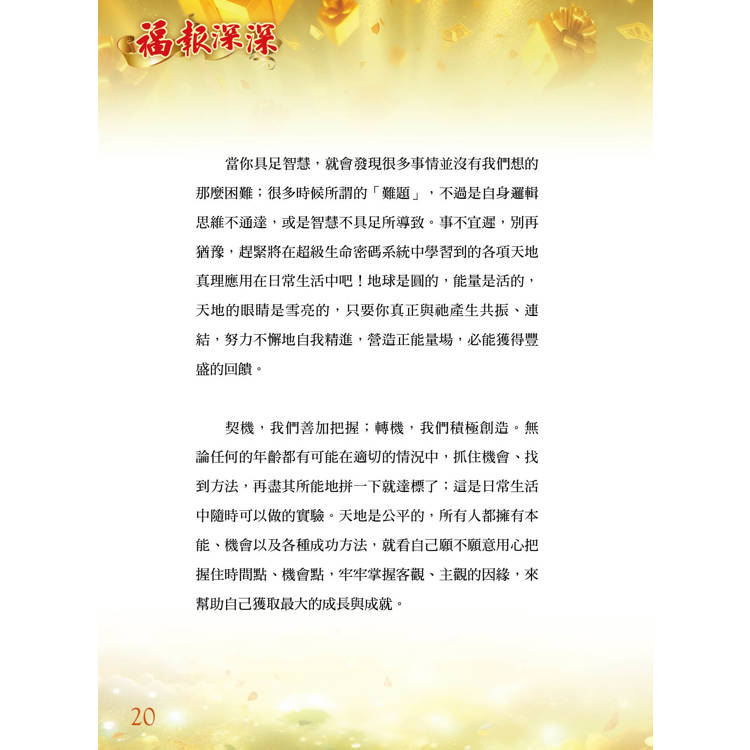 本書之妙在於詳盡收錄許多至關重要的實例與觀念,幫助我們釐清邏輯思維、作出對應的調整,實際明瞭其中的因果道理,進而見證福報滿盈與自身的德資糧相互輝映。原來人生在世,並非要你糊裡糊塗走一遭,要想改變生命地圖,首先需要設定精準的路線,過程中運用適切的方法,再搭配正確的生命密碼;環環相扣之間才會產生後續的諸多美好成果。如今,既然手上已擁有這本《福報深深》,就不應該再醉生夢死,應在深思熟慮後為自己作出抉擇。每天確切地落實天地真理,親身體會並多方實驗,努力地將每項要點達標做到位,完備積累福德的敲門磚並迅速地增益正能量,進而將自己保送至「福報深深先修班」的行列,讓人生從此刻起脫胎換骨,一帆風順、左右逢源、成就非凡,相信這是你最期待實現的人生總目標。