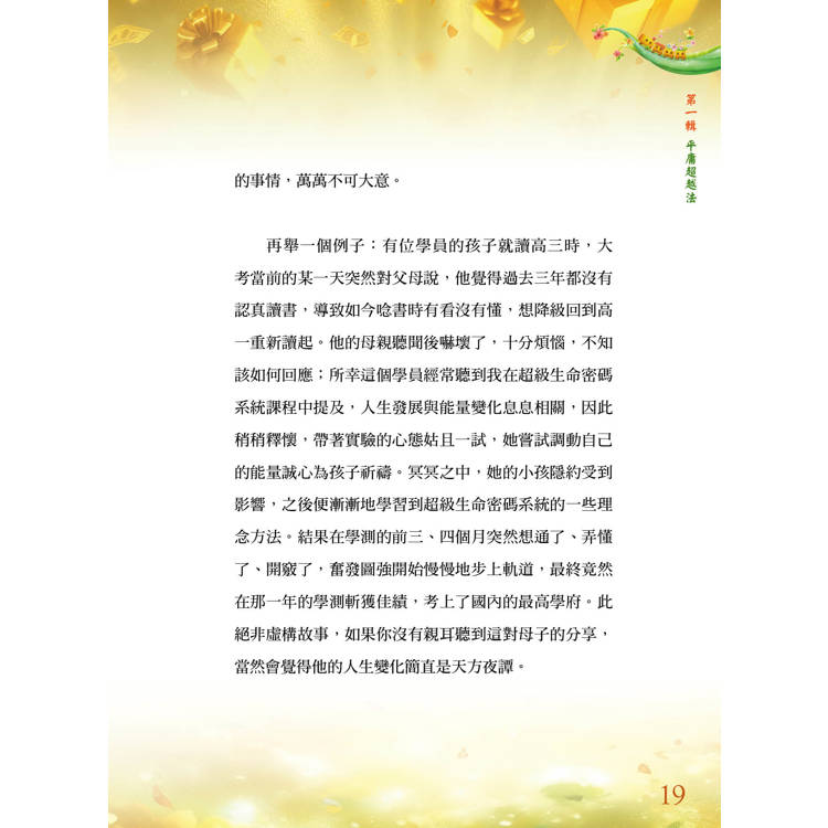 再舉一個例子:有位學員的孩子就讀高三時,大考當前的某一天突然對父母說,他覺得過去三年都沒有認真讀書,導致如今唸書時有看沒有懂,想降級回到高一重新讀起。他的母親聽聞後嚇壞了,十分煩惱,不知該如何回應;所幸這個學員經常聽到我在超級生命密碼系統課程中提及,人生發展與能量變化息息相關,因此稍稍釋懷,帶著實驗的心態姑且一試,她嘗試調動自己的能量誠心為孩子祈禱。冥冥之中,她的小孩隱約受到影響,之後便漸漸地學習到超級生命密碼系統的一些理念方法。結果在學測的前三、四個月突然想通了、弄懂了、開竅了,奮發圖強開始慢慢地步上軌道,最終竟然在那一年的學測斬獲佳績,考上了國內的最高學府。此絕非虛構故事,如果你沒有親耳聽到這對母子的分享,當然會覺得他的人生變化簡直是天方夜譚。