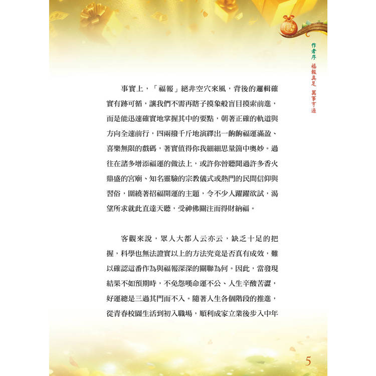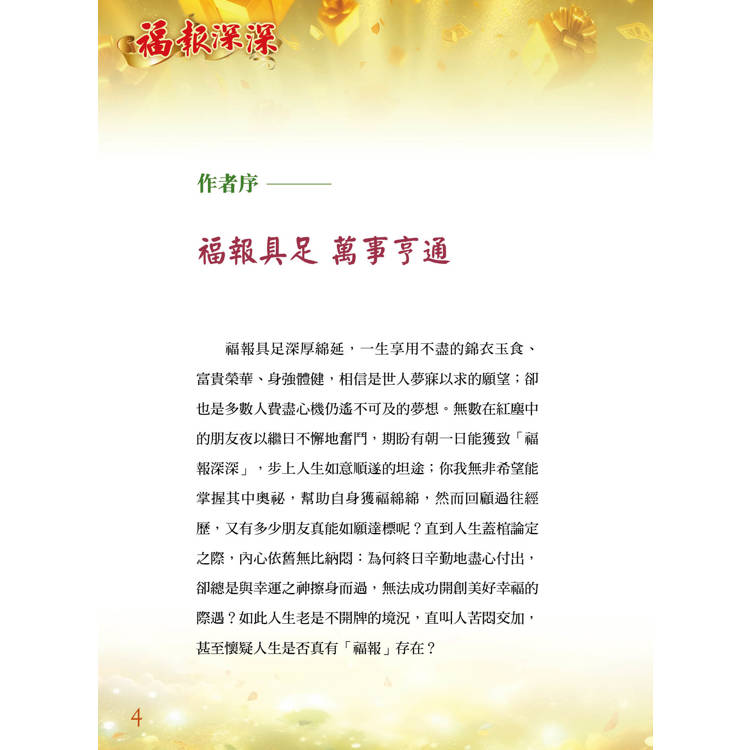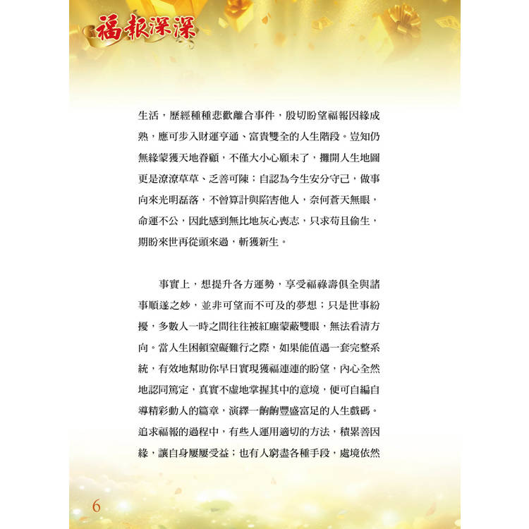 事實上,想提升各方運勢,享受福祿壽俱全與諸事順遂之妙,並非可望而不可及的夢想;只是世事紛擾,多數人一時之間往往被紅塵蒙蔽雙眼,無法看清方向。當人生困頓窒礙難行之際,如果能值遇一套完整系統,有效地幫助你早日實現獲福連連的盼望,內心全然地認同篤定,真實不虛地掌握其中的意境,便可自編自導精彩動人的篇章,演繹一齣齣豐盛富足的人生戲碼。追求福報的過程中,有些人運用適切的方法,積累善因緣,讓自身屢屢受益;也有人窮盡各種手段,處境依然困難重重,於是日日怨嘆上天不公,陷入負面的惡性循環。兩者如天堂與地獄般懸殊的差異,端視我們是否能找到正確的捷徑、方式,或是依循明師、智者的引領,釐清生活中錯綜複雜的脈絡,早日輕鬆邁向「福報深深」的境界。