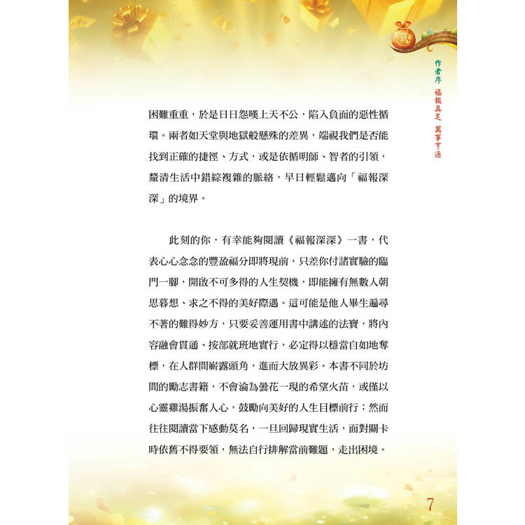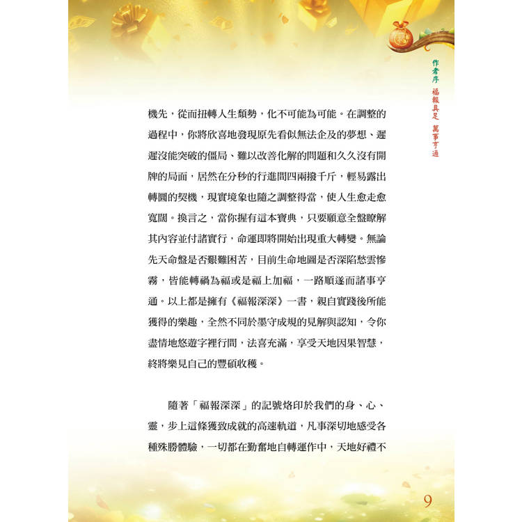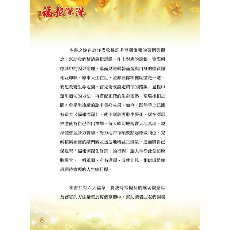 本書共有六大篇章,將我時常提及的確切觀念以及務實的方法彙整於每個章節中,幫助讀者朋友們洞燭機先,從而扭轉人生頹勢,化不可能為可能。在調整的過程中,你將欣喜地發現原先看似無法企及的夢想、遲遲沒能突破的僵局、難以改善化解的問題和久久沒有開牌的局面,居然在分秒的行進間四兩撥千斤,輕易露出轉圜的契機,現實境象也隨之調整得當,使人生愈走愈寬闊。換言之,當你握有這本寶典,只要願意全盤瞭解其內容並付諸實行,命運即將開始出現重大轉變。無論先天命盤是否艱難困苦,目前生命地圖是否深陷愁雲慘霧,皆能轉禍為福或是福上加福,一路順遂而諸事亨通。以上都是擁有《福報深深》一書,親自實踐後所能獲得的樂趣,全然不同於墨守成規的見解與認知,令你盡情地悠遊字裡行間,法喜充滿,享受天地因果智慧,終將樂見自己的豐碩收穫。
