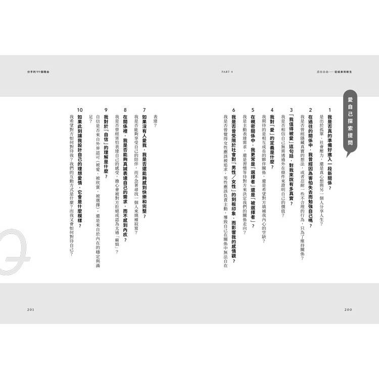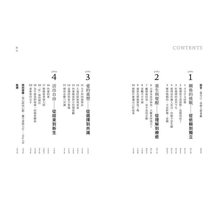 隨著一點一滴的內在覺察與練習,我益發接納每個面向的自己,無論是單純的、善感的、有愛的、世故的、鋒利的、不自信的、懶散的、自我的,那都是值得溫柔以待的部分。告別婚姻幾年後,內心強大了很多,此刻我知道,是能夠面對下一段親密關係的時候了。若曾面臨情感低潮,或對親密關係感到迷惘的你,也正思考是否有能力與勇氣迎接一段嶄新的親密關係,這些體悟,會在書中的第四部分呈現。