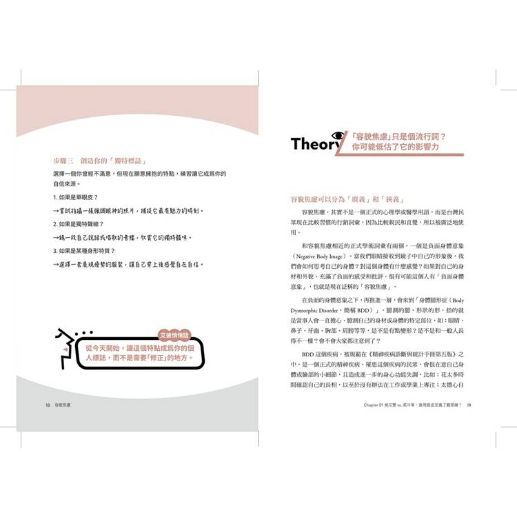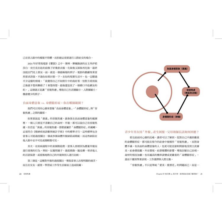 以心理學視角出發,釐清「容貌焦慮」與「負面身體意象」、「身體臆形症」之間的關係,為讀者建立清楚的認知基礎。