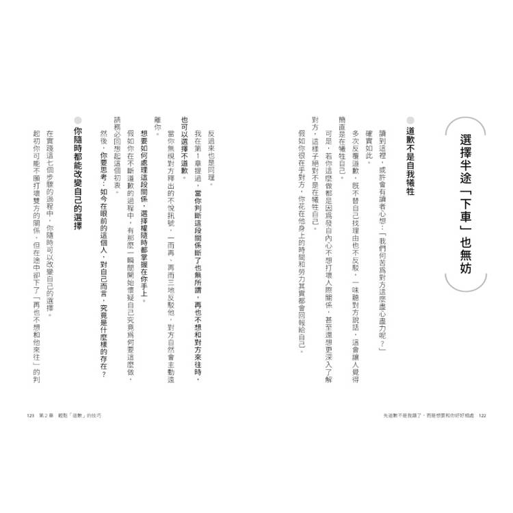 尤其,在親近的人際關係(包括夫妻、親子、主管和下屬、同事、前輩、朋友和情人)中,若能在必須道歉的場合好好表達歉意,等到事後回顧時,你將會察覺自己得到了很大的收穫。