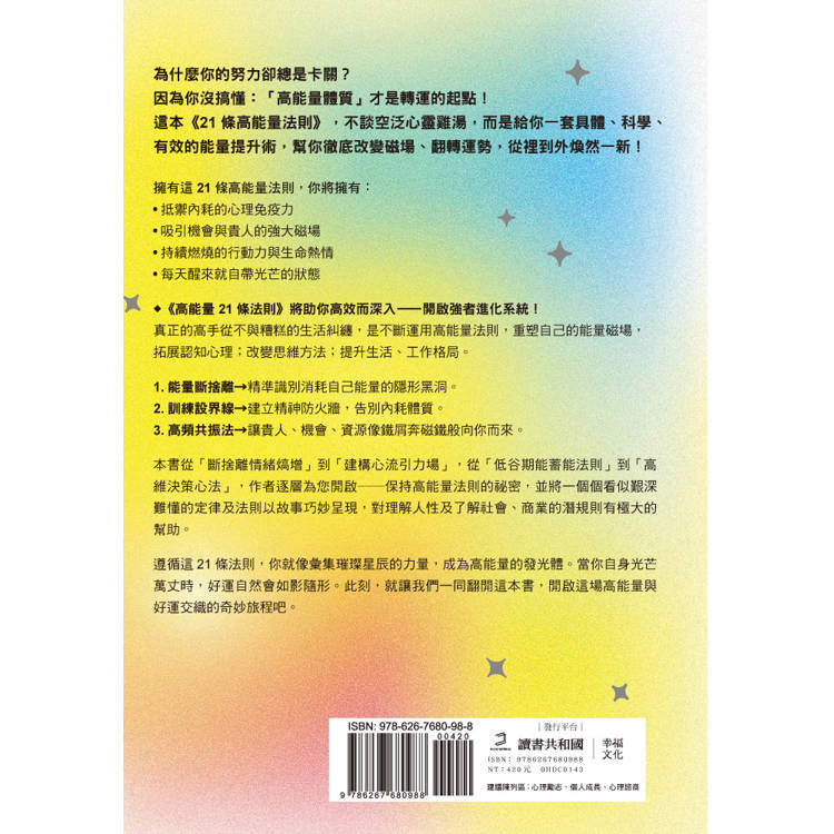 這本《高能量21法則》,不談空泛心靈雞湯,而是給你一套具體、有效的能量提升術,幫你徹底改變磁場、翻轉運勢,從裡到外煥然一新!