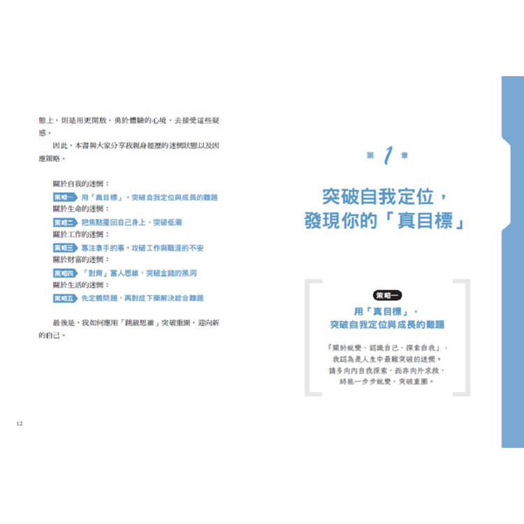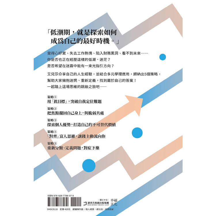 多數人經歷過的情緒起伏,她也一項都沒落下;但現實讓她明白,一個人的人生不是只關於自己,但當你勇敢踏出第一步,就自然會摸索出方向,突破關卡。低潮困頓時期,反而是探索如何成為自己的最好時機。本書將分享5個策略,幫助大家一步步蛻變,突破重圍: