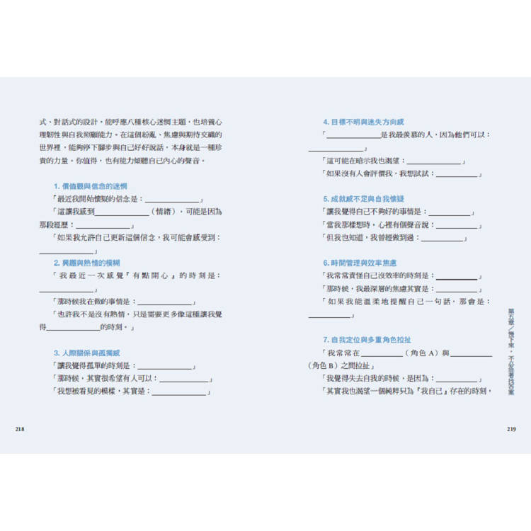 允許自己在混沌中慢下來,向內探問、拆解困惑,才能對症下藥,從卡住狀態中釐清下一步行動的起點。不妨跟著試試看: