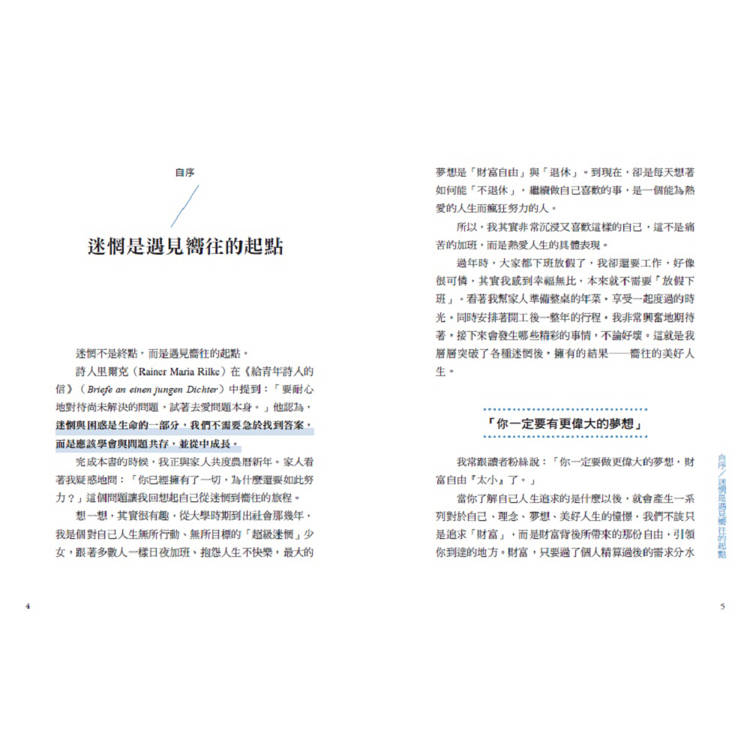 如今,我已能用與20 歲時期截然不同的態度,去面對迷惘、低潮、谷底、挫敗,反而一次比一次更熱烈地擁抱迷惘,視之為生命的禮物,我用獲得的體悟醞釀專屬自己的獨特人生,找出內心深處真正的嚮往人生。